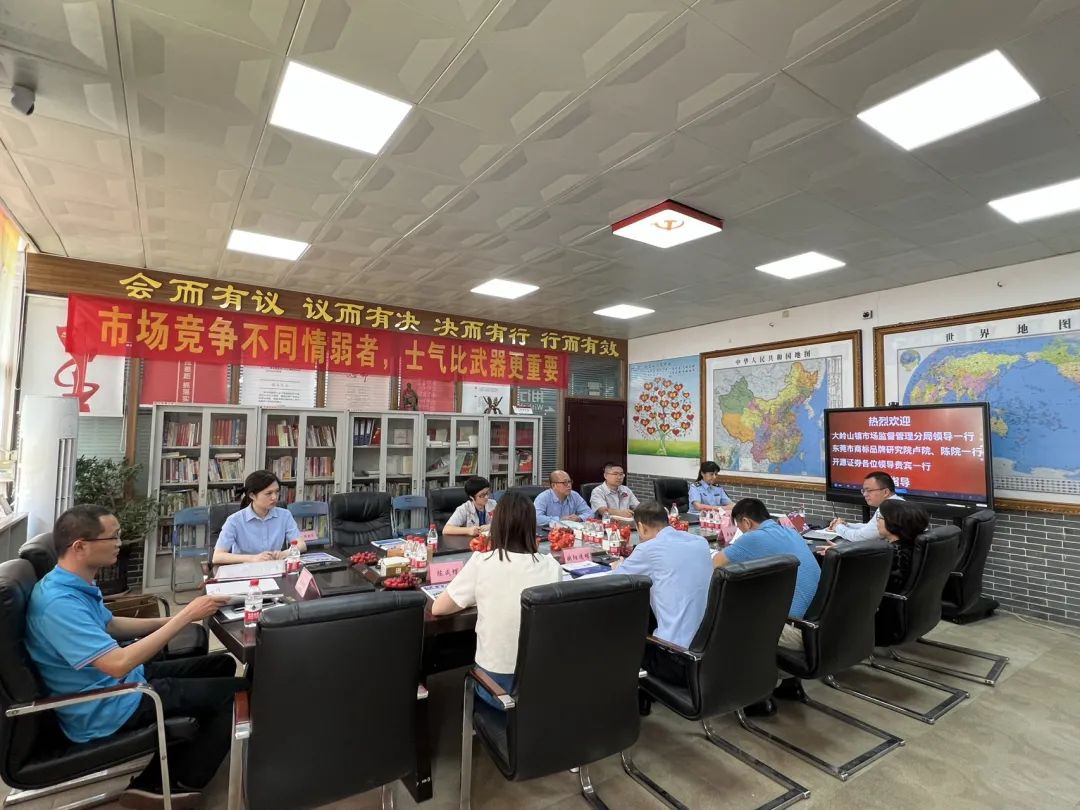 5月15日,大嶺山市場監(jiān)管局調(diào)研員高級主辦劉明周、監(jiān)管二股股長歐陽送明一行,東莞市商標品牌研究院榮譽院長盧靜娜、副院長陳成蝶、智庫專家周沛